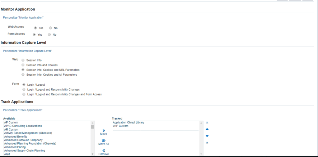 Set Web Access to “Yes” then Select “Information Capture Level” as you desired. (I pick “Session Info” only), then move all the “Application” you wish to track under “Track Application”. This will required JVM bounce.